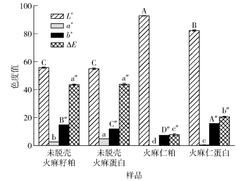 色泽是影响火麻蛋白在市场上接受度的一个重要因素,因此,本研究分析了脱壳处理对火麻蛋白色度值的影响,结果见图1。