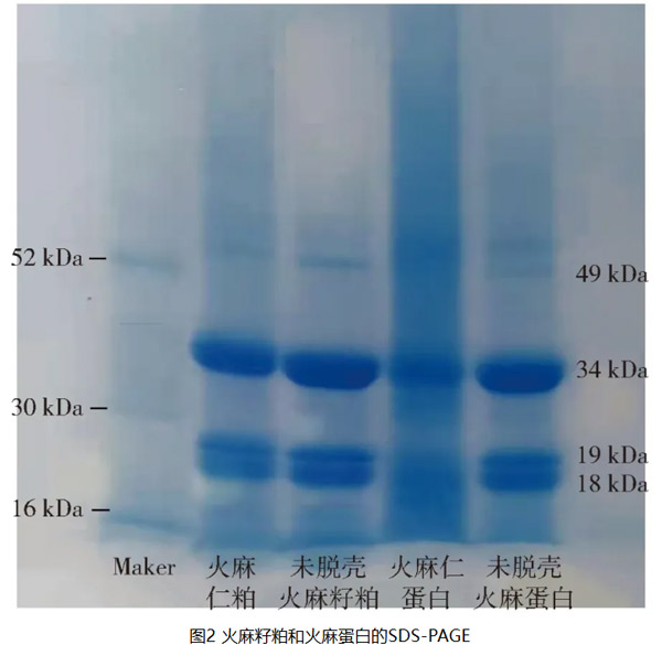 火麻蛋白主要由麻仁球蛋白(约75%)和白蛋白(约25%)组成[20]。其中,麻仁球蛋白类似于大豆球蛋白,是由6个相同的单体组成。每个单体由一个酸性基团(AS)和碱性基团(BS)组成,由一个二硫键连接[3]。由图2可知,总体上看,火麻籽粕原料和碱提的火麻蛋白在电泳图谱上有很大的相似性,表明碱提过程对火麻蛋白的亚基组成没有显著的影响。两种火麻籽粕原料和火麻蛋白都在34 kDa和20 kDa附近产生了比较明显的亚基条带,在49 kDa附近还有一条比较淡的亚基条带,这也表明脱壳处理对碱提后的火麻蛋白亚基的组成没有影响。