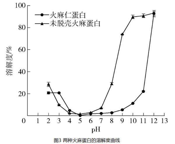蛋白质溶解度是发挥其他功能特性的基础,脱壳与未脱壳火麻蛋白的溶解度见图3。