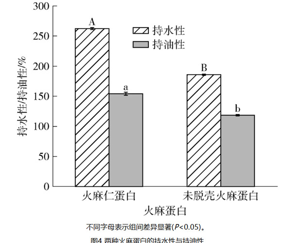 蛋白质的持水性和持油性不仅影响着蛋白质产品的感官品质,也影响着食品加工、储藏过程中的物理特性,脱壳处理对火麻蛋白持水性与持油性的影响见图4。